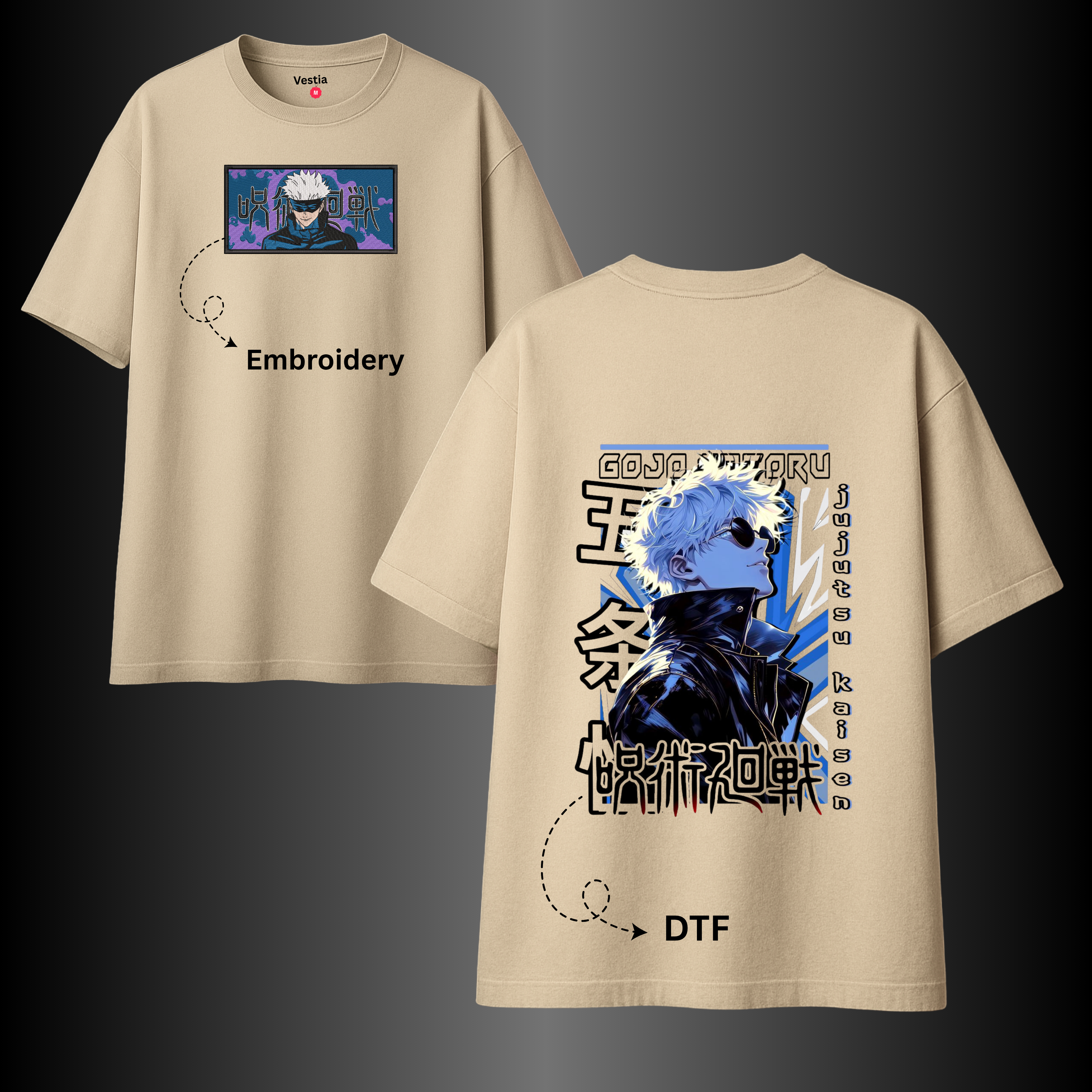 Gojo Satoru Anime T-Shirt – Embroidery & DTF Combo | Jujutsu Kaisen Premium Tee by Vestia